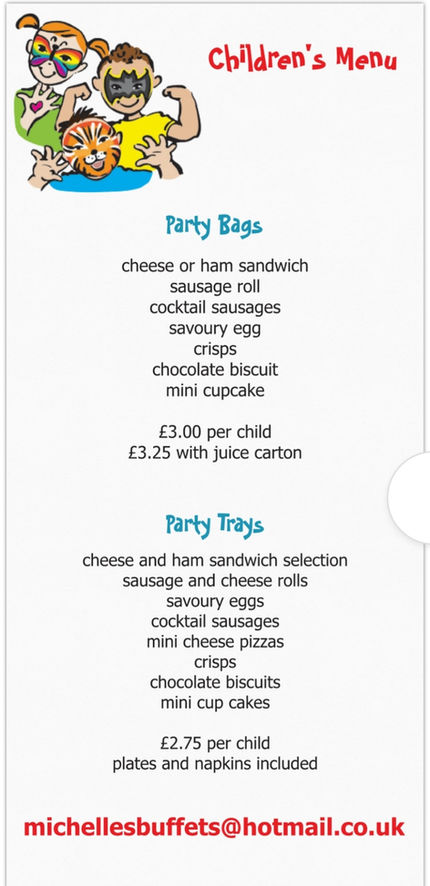 Cheese and ham sandwiches Savoury egg Cocktail sausages Sausages and cheese rolls Mini pizzaCrisps Biscuits Mini cupcakes£2.75 per child Plates and napkins included